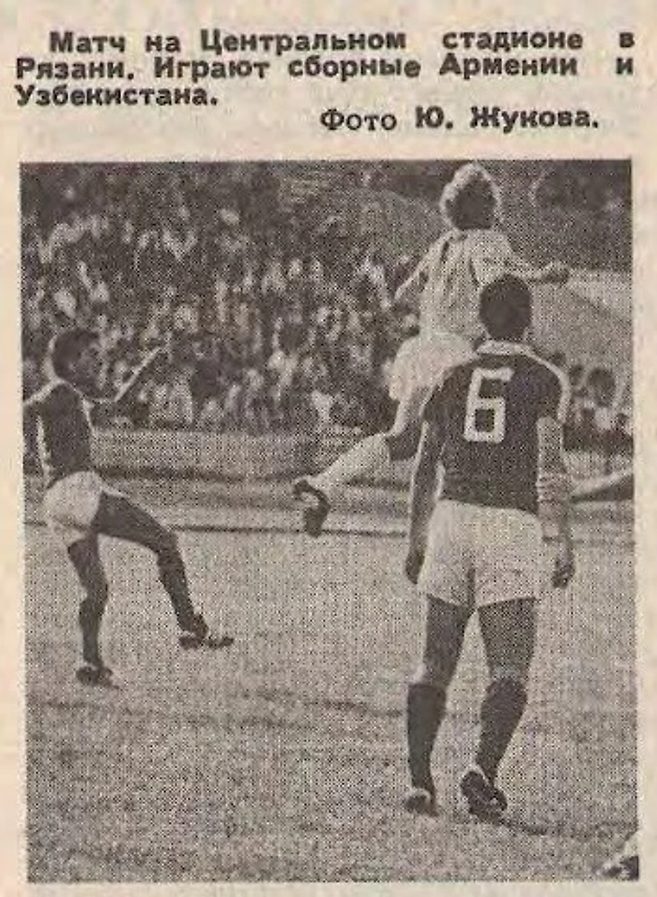 24 июля 1983 года. Рязань. Центральный стадион. VIII Летняя Спартакиада народов СССР. Футбольный турнир. 1-й этап. Подгруппа II. Армения - Узбекистан - 2:1 (0:0). Первым на мяче Андрей Медянский (№ 5) - защитник сборной Узбекской ССР и джизакской «Звезды» (фото Ю. Жукова из еженедельника «Футбол-Хоккей» № 31 от 31 июля 1983 года)