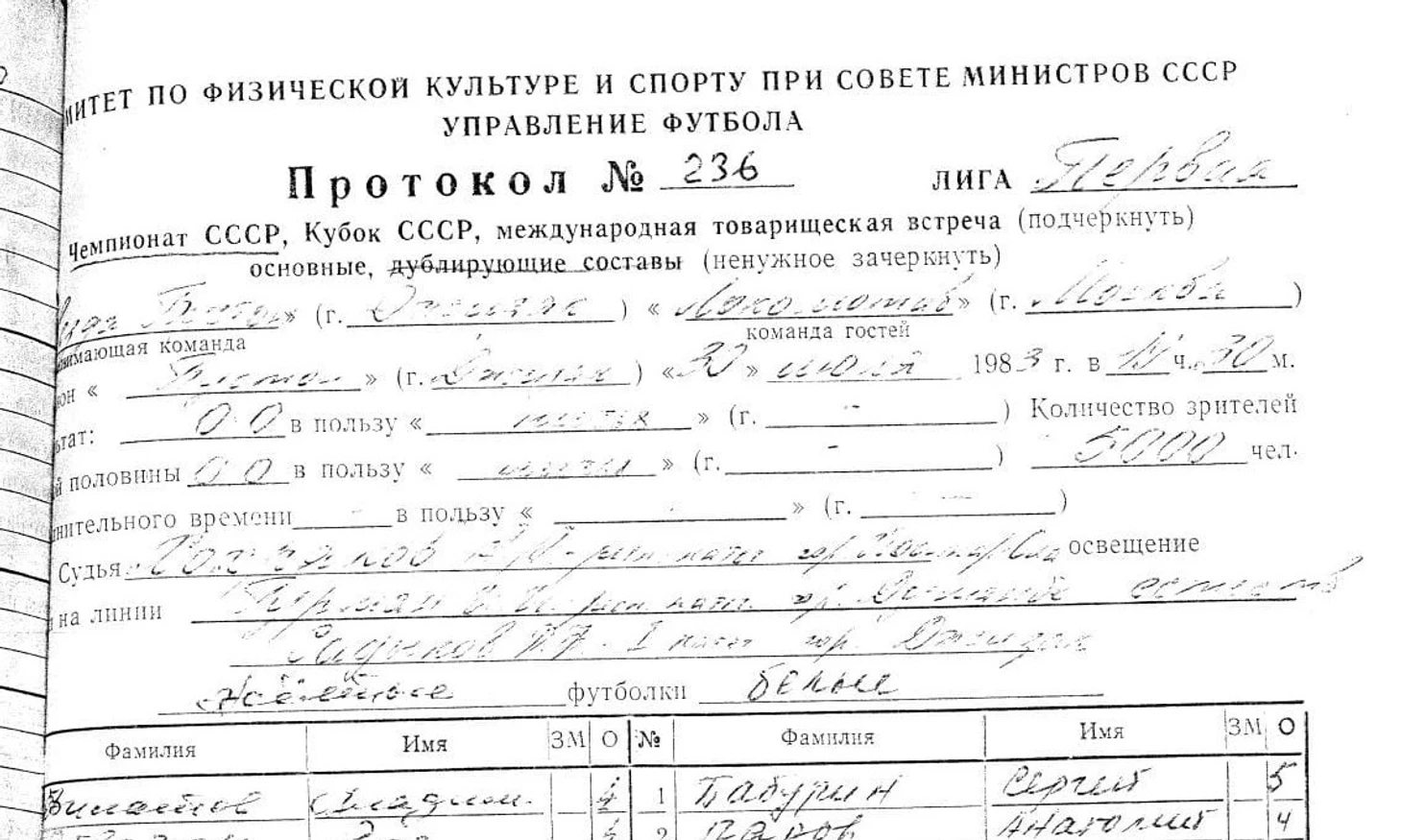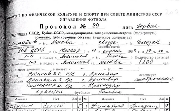 Фрагмент протокола матча «Звезда» (Джизак) - «Локомотив» (Москва), состоявшегося 30 июля 1983 года в Джизаке. Среднеазиатские армейцы играли в желтых футболках