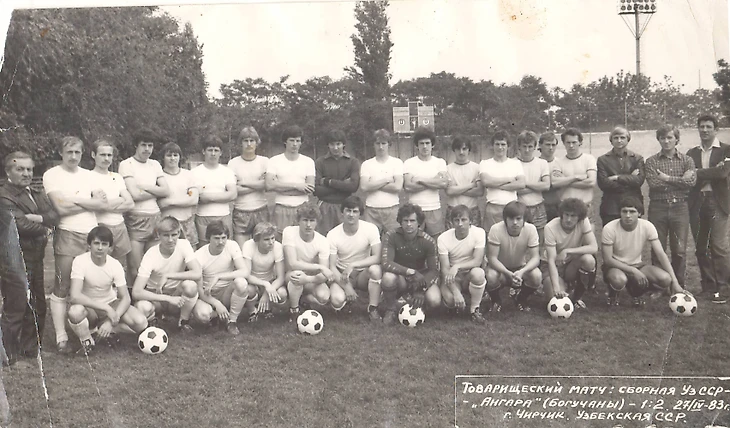 27 июня 1983 года. Чирчик. Сборная Узбекская СССР при подготовке к VIII Летней Спартакиаде народов СССР. Совместное фото после товарищеского матча с чемпионом Красноярского края командой «Ангара» (Богучаны)