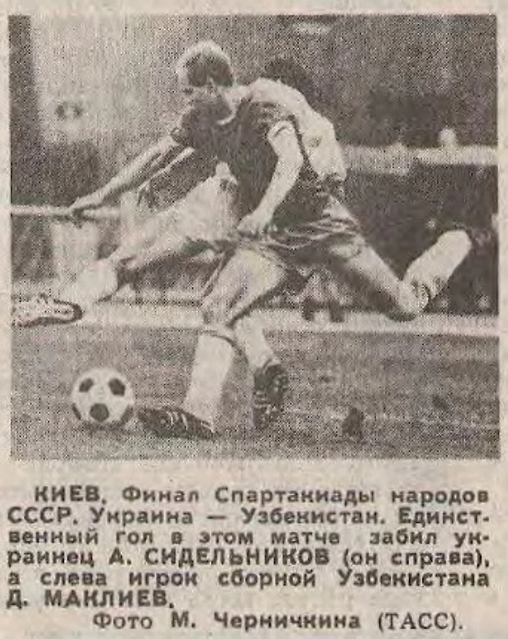 27 июля 1986 года. Киев. Республиканский стадион. IX Летняя Спартакиада народов СССР. Футбольный турнир. финал. Украина - Узбекистан - 1:0 (1:0). Единоборство Д. Маклиева и А. Сидельникова (фото М. Черничкина из еженедельника «Футбол-Хоккей» № 31 от 3 августа 1986 года)