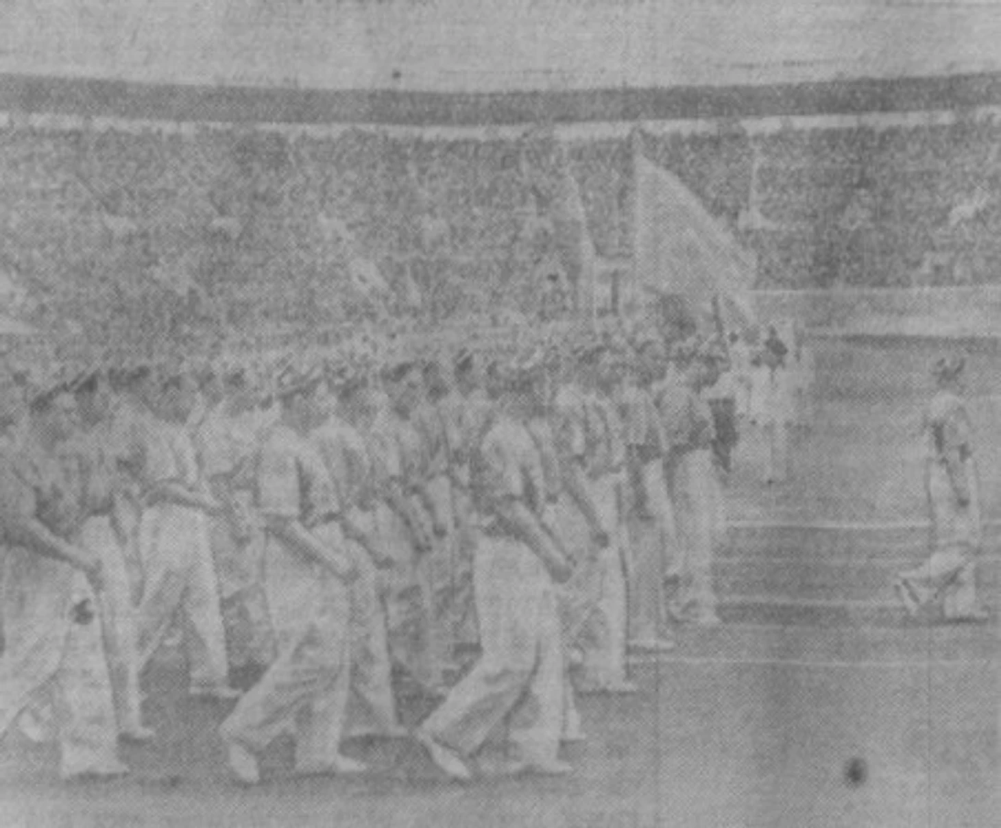 5 августа 1956 года. Москва. Центральный стадион им. В.И. Ленина. Летняя Спартакиада народов СССР. Церемония открытия. «Колонна узбекских спортсменов на параде» (газета «Правда Востока» № 185 от 8 августа)