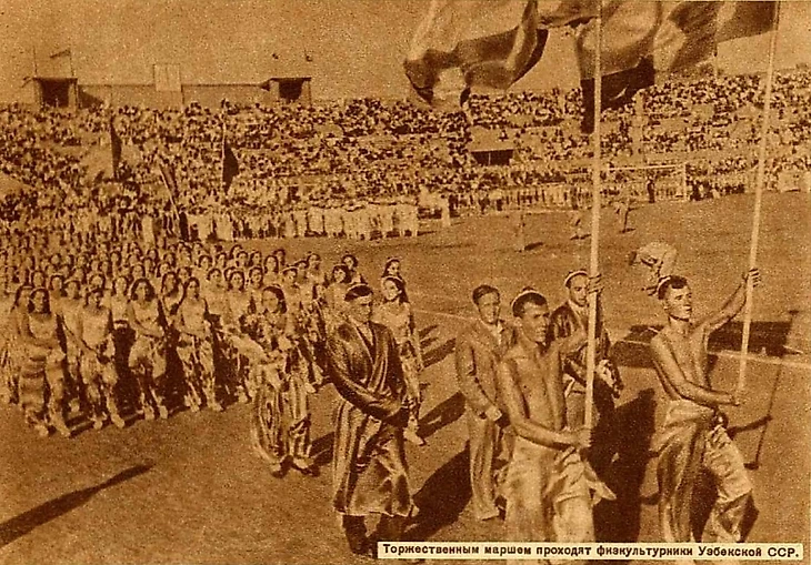 14 июля 1937 года. Москва. Стадион «Динамо». Парад физкультурников. «Торжественным маршем проходят физкультурники Узбекской ССР» (фото из журнала «Физкультура и спорт» № 15 за август 1937 год)