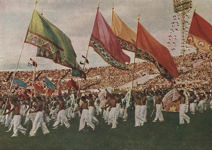 18 июля 1954 года. Москва. Стадион «Динамо». Парад физкультурников. «Выступление физкультурников Узбекской ССР» (фото Дмитрия Бальтерманца и Самария Гурария)