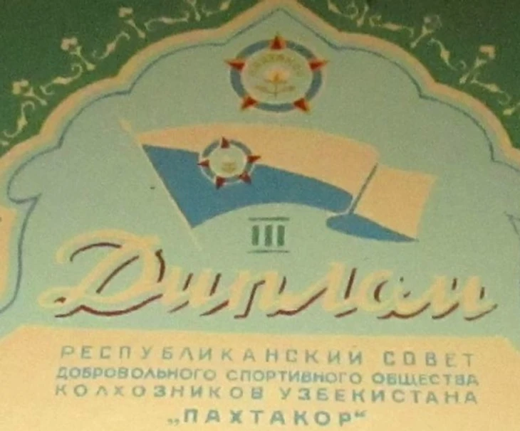 1950-е годы. Фрагмент диплома Добровольного спортивного общества колхозников Узбекистана «Пахтакор»