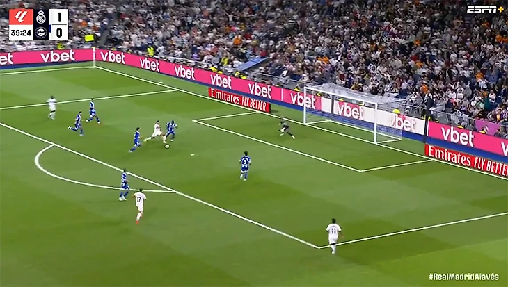 «Мадрид» повел уже на первой минуте: во вратарскую прорвался Винисиус, отправил мяч под удар Лукасу Васкесу – и тот закатил в ворота. Молниеносный гол на 55-й секунде, защитники «Алавеса» даже ничего не поняли.
