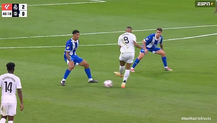 На 40-й «Мадрид» удвоил счет. Вышло очень изящно: Килиан Мбаппе подхватил мяч далеко от штрафной и пяткой отыгрался с Джудом Беллингемом, от которого получил ответный пас. Француз сам разобрался внутри штрафной – продлил голевую серию за «Реал» до пяти матчей.