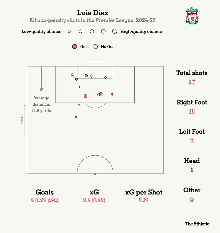В этом сезоне также мало игр, и «Ливерпулю» еще предстоит сыграть с кем-то из семерки лучших игроков прошлого сезона. Возможно, Диас вернется к средним показателям по ходу сезона.