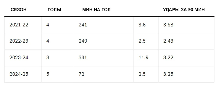 Его побуждают его чаще оказываться между штангами, так что не случайно его Ожидаемые голы за удар вырос с 0,13 до 0,19.