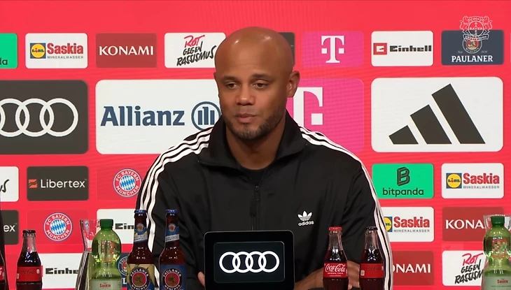 «Здравствуйте! Венсан Компани, что вы сказали Йозуа Киммиху перед матчем? Он занимал разные позиции на поле, иногда опускался ниже и строил игру на позиции левого защитника, а также временами он действовал и на позиции правого защитника против Флориана Виртца, поддерживая Альфонсо Дэвиса. Как вы готовили его к этой игре?».