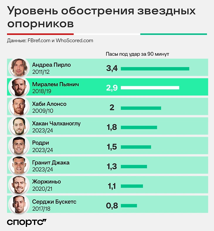 Больше всего поражало, что он не потерял в остроте. Играя на 20 метров ниже, Пьянич выдавал цифры на уровне лучших творцов планеты – включая Де Брюйне и Месси. Ни Родри, ни Чалханоглу не приблизились к его уровню. Только Пирло творил еще ярче.