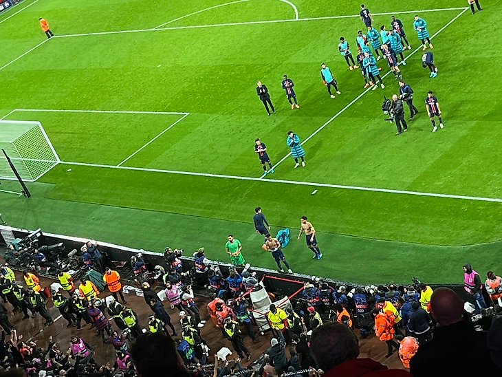 А еще у меня оказался прекрасный вид на сектор с болельщиками парижан. Мне пришлось слушать весь матч их шум (надо отдать им должное, они не замолкал на протяжении всего матча), ну а им пришлось смотреть как в ворота Доннарумы перед их носом залетают мячи. Вот «Арсенал» отмечает первый – после того, как огромный Джанлуиджи долго искал в воздухе свои очки, чем и воспользовался Кай Хавертц.