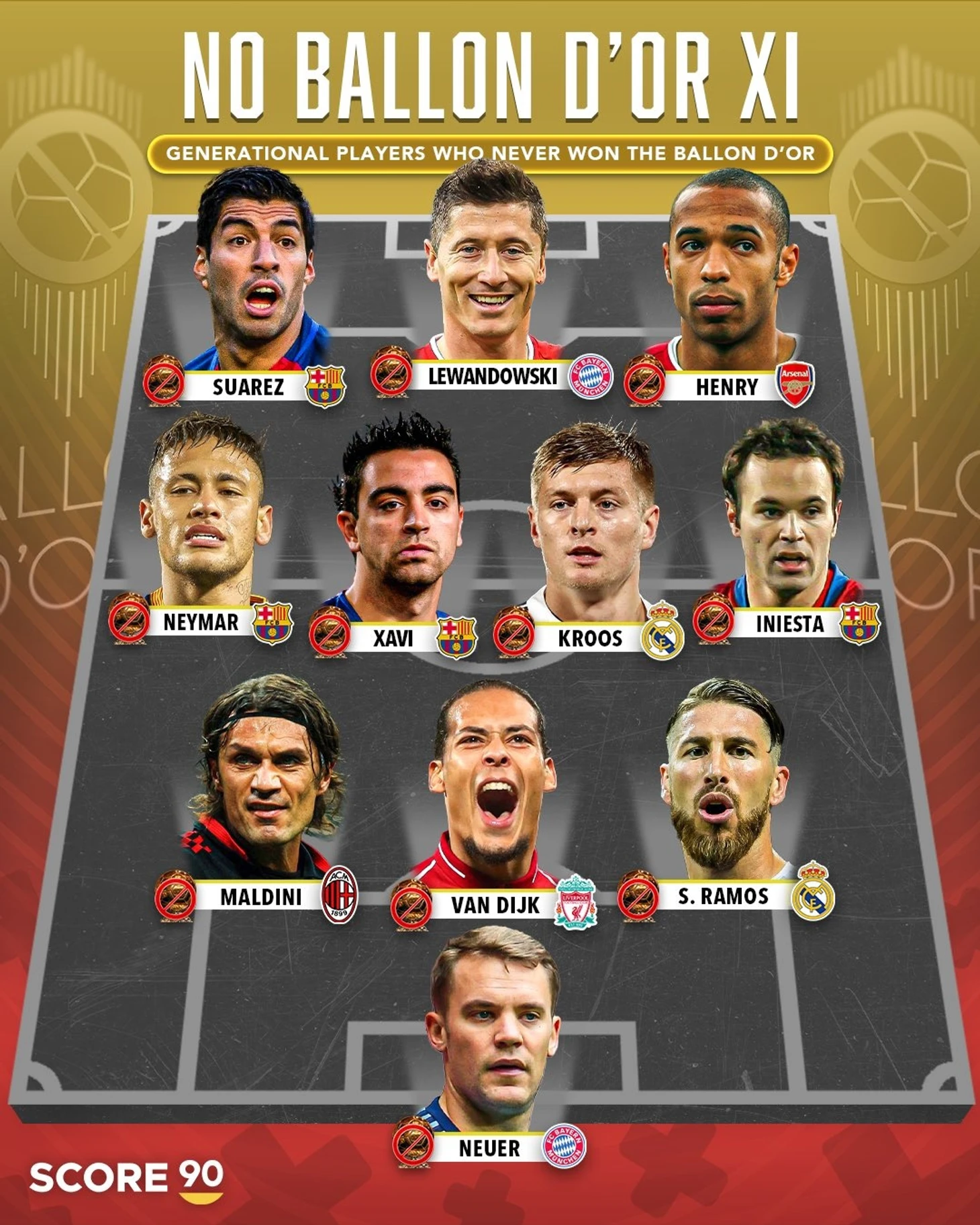 В разные годы без «Золотого мяча» оставались великолепные футболисты, которые бы обязательно взяли награду, если бы обстоятельства сложились иначе. Портал Score 90 собрал символическую сборную футболистов без «Золотого мяча», в команду попали ярчайшие представители своего поколения.