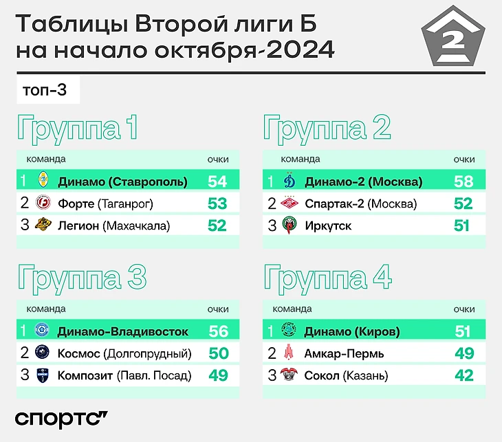 Кстати, во Второй лиге Б есть еще несколько «Динамо». Например, дубль махачкалинского «Динамо» идет последним в первой группе, «Динамо-Вологда» – середняк группы 2, там рядом и «Динамо» СПб. «Динамо-Барнаул» – в серединке группы 4.