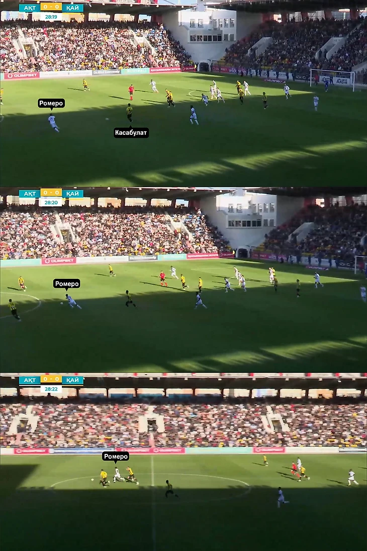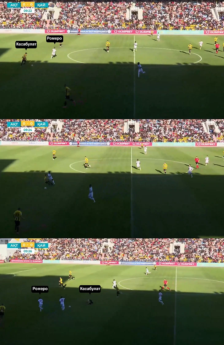 Главный антигерой первого тайма – Дамир Касабулат. Центральный защитник «Кайрата» действовал неуверенно и медлительно, из-за чего Дорни Ромеро несколько раз ловил защитника на ошибках.