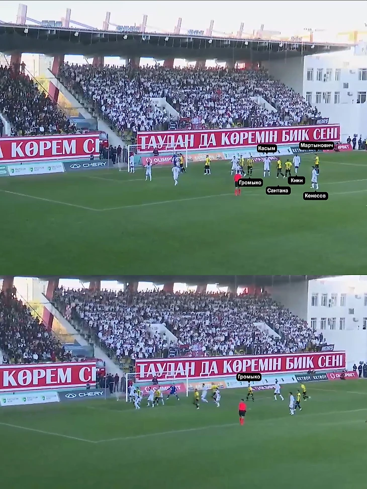 Как так получилось? При розыгрышах «Актобе» использовал персональную защиту: Алибек Касым и Габи Кики отвечали за Элдера Сантану и Александра Мартыновича – двух самых опасных игроков на втором этаже. Без визави остались двое: стоявший у штрафной Кенесов и спорящий с судьей Струмия. Скорее всего, именно аргентинец должен был отвечать за Громыко, но не успел занять позицию из-за спора с судьей после не назначенного пенальти в ворота «Кайрата».