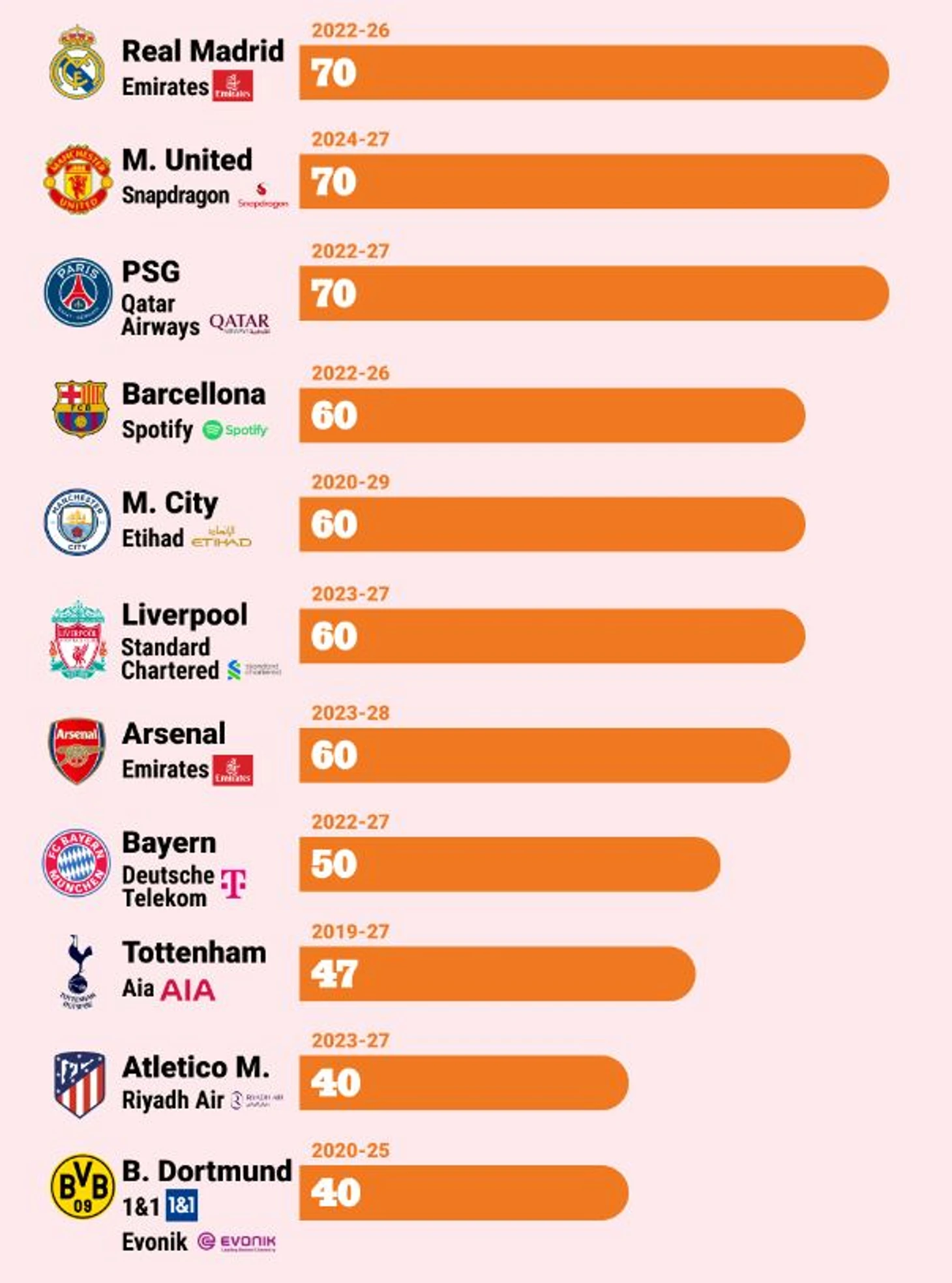 1) Все цифры в посте инсайдерские? Потому что ряд клубов вроде как не раскрывает условия спонсорских контрактов. И там есть ещё и бонусы/штрафы за хорошее/плохое выступление в ЛЧ и т.п. Т.е. суммы приблизительные. В случае с Барсой 2 года разные цифры по Spotify читаю в отчётах разных аналитиков))