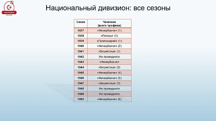 «Фенербахче» стал чемпионом Национального дивизиона шесть раз: в 1937 г., 1940 г., 1943 г., 1945 г., 1946 г. и 1950 г.