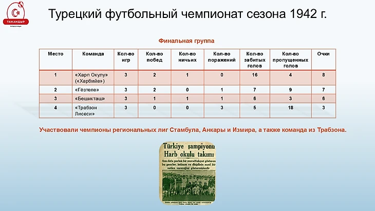 До 1942 г. Турецкий футбольный чемпионат представлял собой по природе «кубковый» турнир с играми на вылет. Затем внесли небольшие изменения: отныне формировалась группа сильнейших, в которую, однако, попадали всего четыре клуба. Эти четыре команды и разыгрывали между собой чемпионство, причем даже без игр в формате «дом + выезд»: всего по три матча у каждого клуба. Ниже – результаты розыгрыша 1942 г. в качестве примера.