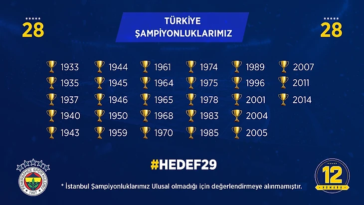 Согласно официальной позиции TFF для звезд должны учитываться чемпионства в Супер Лиге. По мнению же «Фенербахче» заслуги в период, предшествовавший созданию Супер Лиги в 1959 г., а именно чемпионства в Турецком футбольном чемпионате (три) и Национальном дивизионе (шесть), также должны быть отражены на эмблемах клубов.