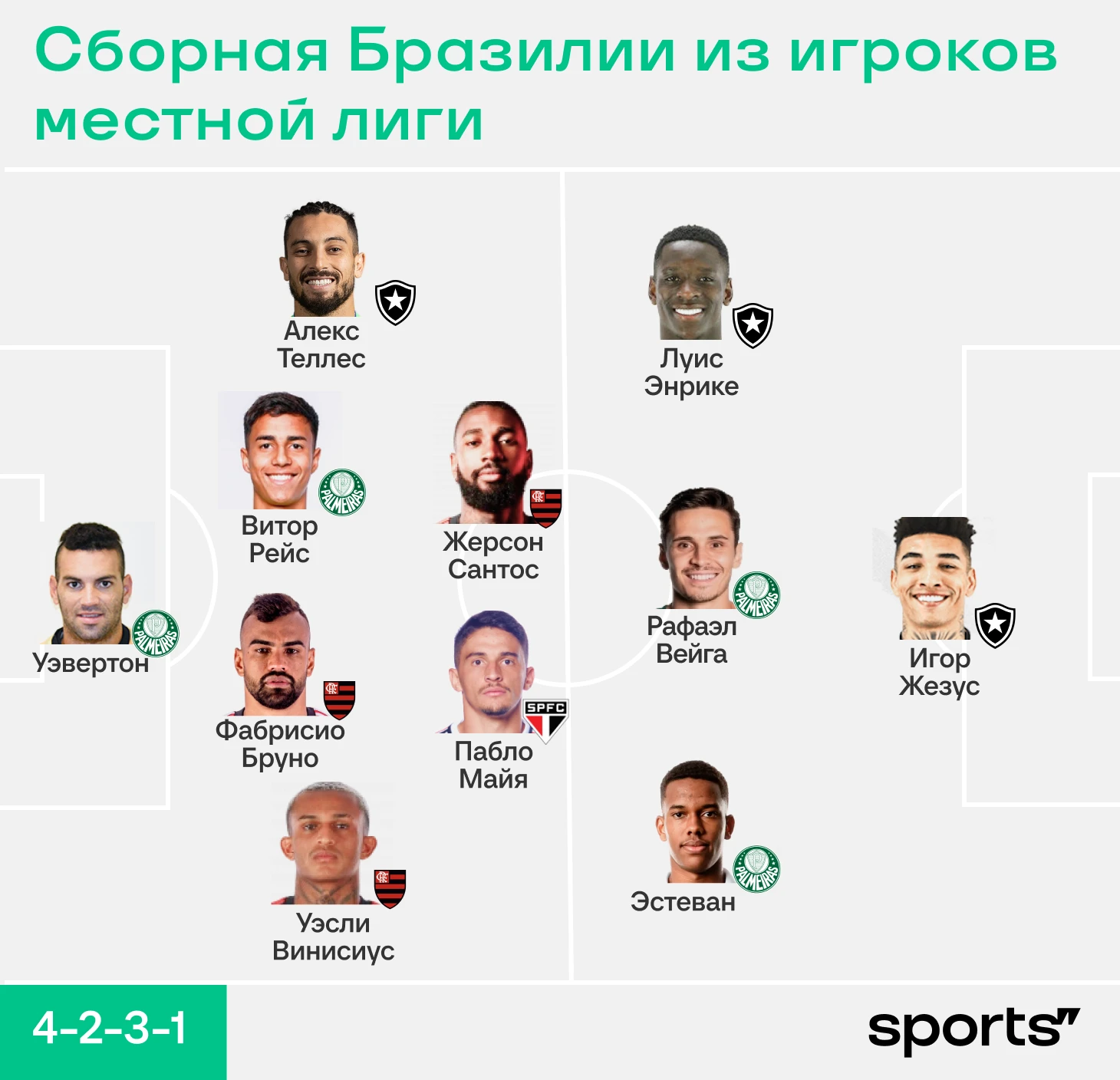 В воротах – 36-летний Уэвертон из «Палмейрас», всю карьеру отыграл на родине. Юных топ-голкиперов в Бразилии сейчас просто нет, даже Бенто Крепски летом поехал в «Аль-Наср». Выделяется 25-летний Уго Соуза из «Фламенго», там конкурирует с 22-летним Матеусом Донелли.
