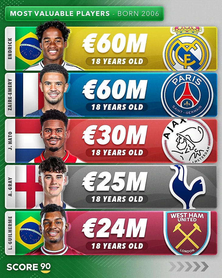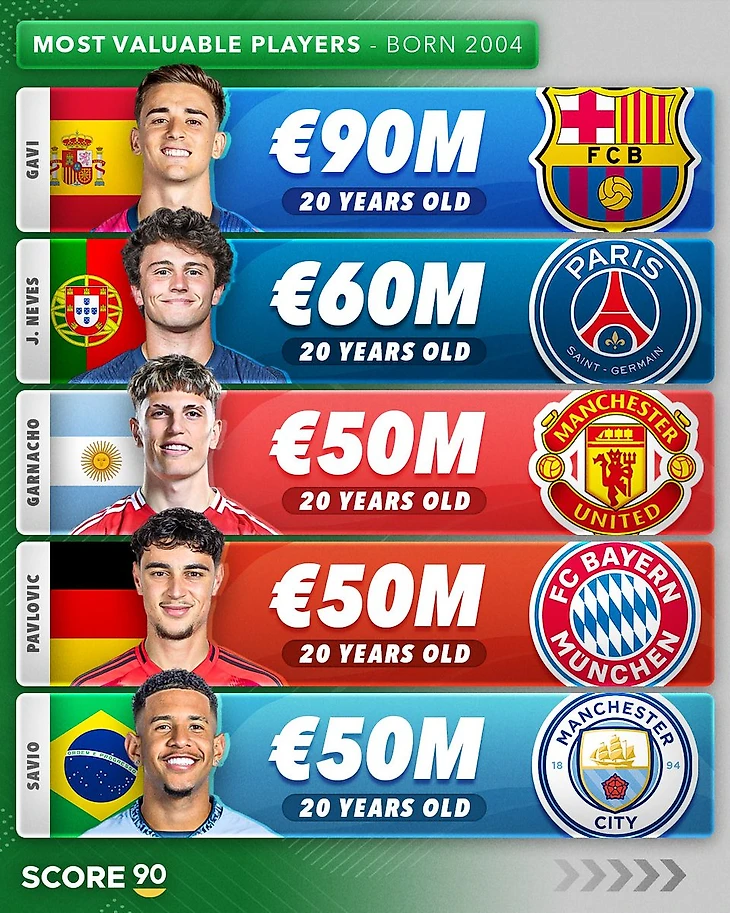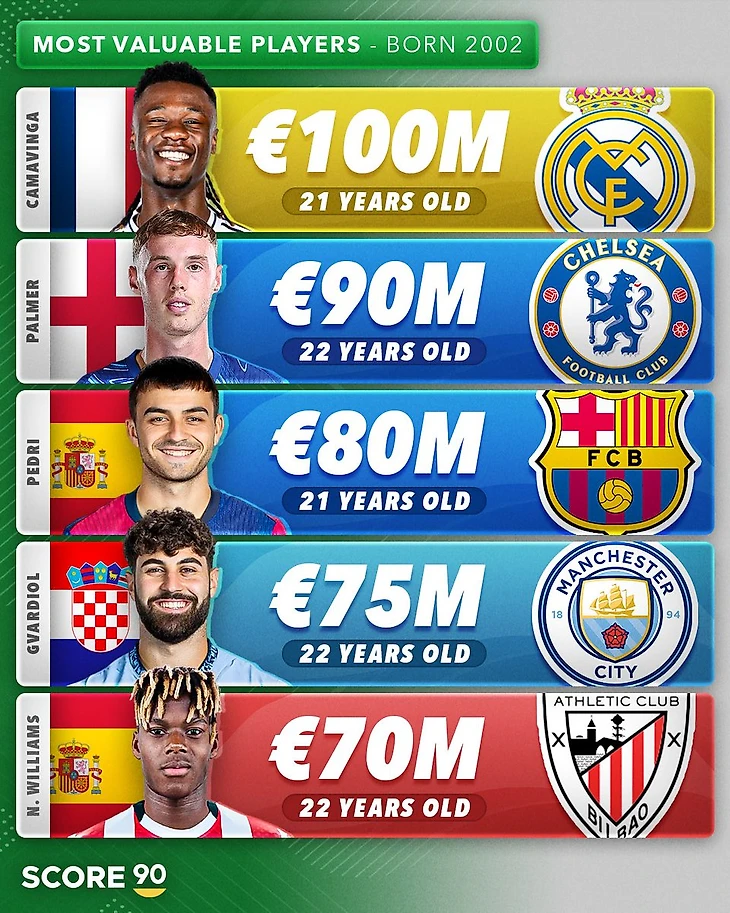 В футболе происходит бесконечная смена поколений – на элитный уровень уже выходят игроки, рожденные в 21 веке. Портал Score 90 собрал списки из пяти самых дорогих футболистов по каждому году рождения с 2002-го по 2007-й.