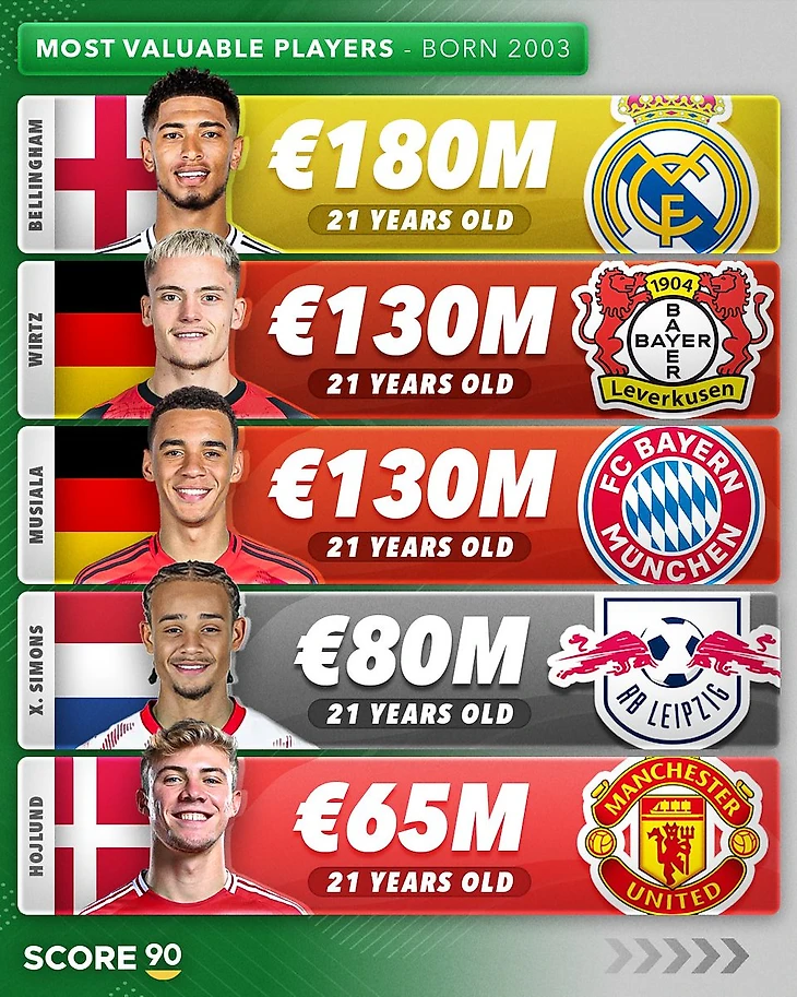 Джуд Беллингем родился в 2003-м, но уже стоит 180 млн евро – третий в списке всех футболистов (после Эрлинга Холанда и Винисиуса).