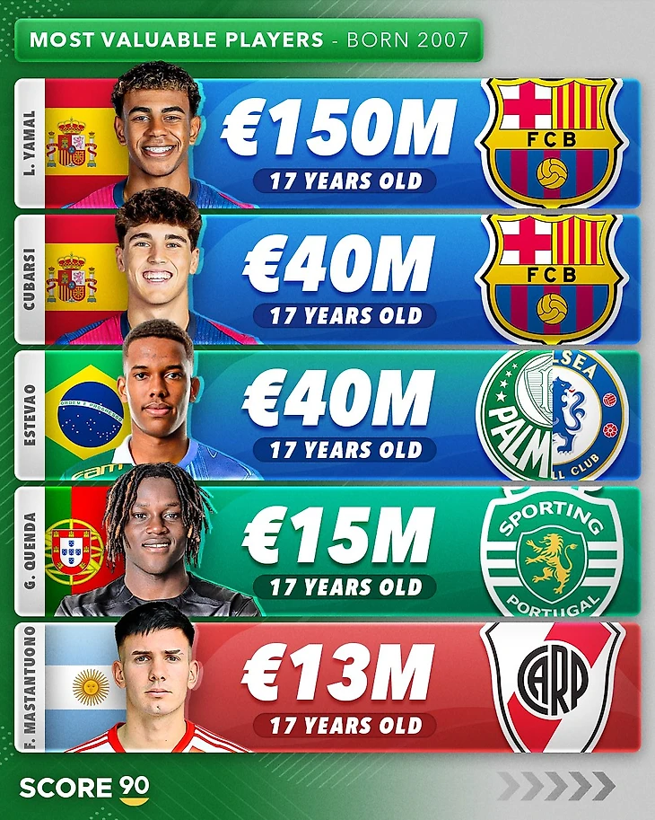 Пока нет предпосылок, что рейтинг самых дорогих игроков 2007 г.р. когда-то изменится – настолько хорош Ламин Ямаль.