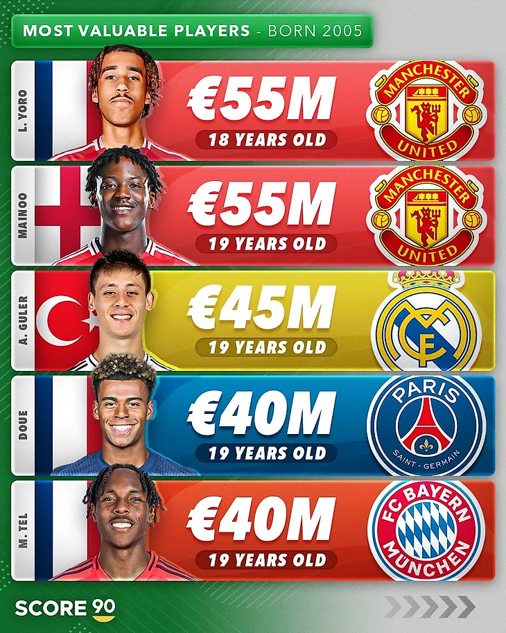 Самые дорогие игроки 2005 года рождения играют в «Манчестер Юнайтед». Лени Йоро пока на травме, а Кобби Майну сверкает в основе еще с прошлого сезона.