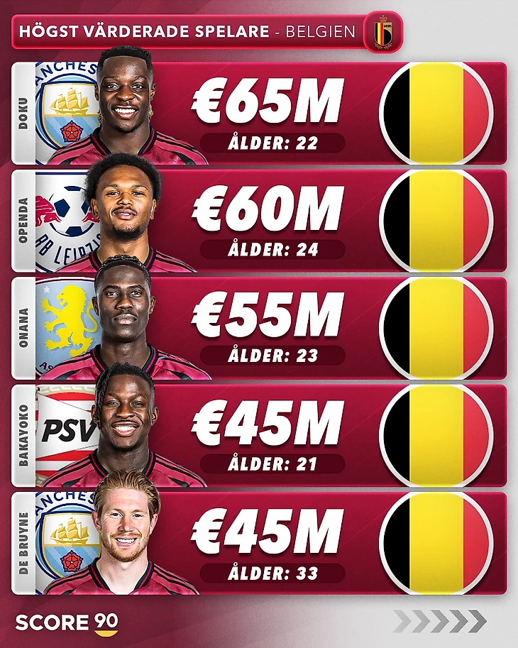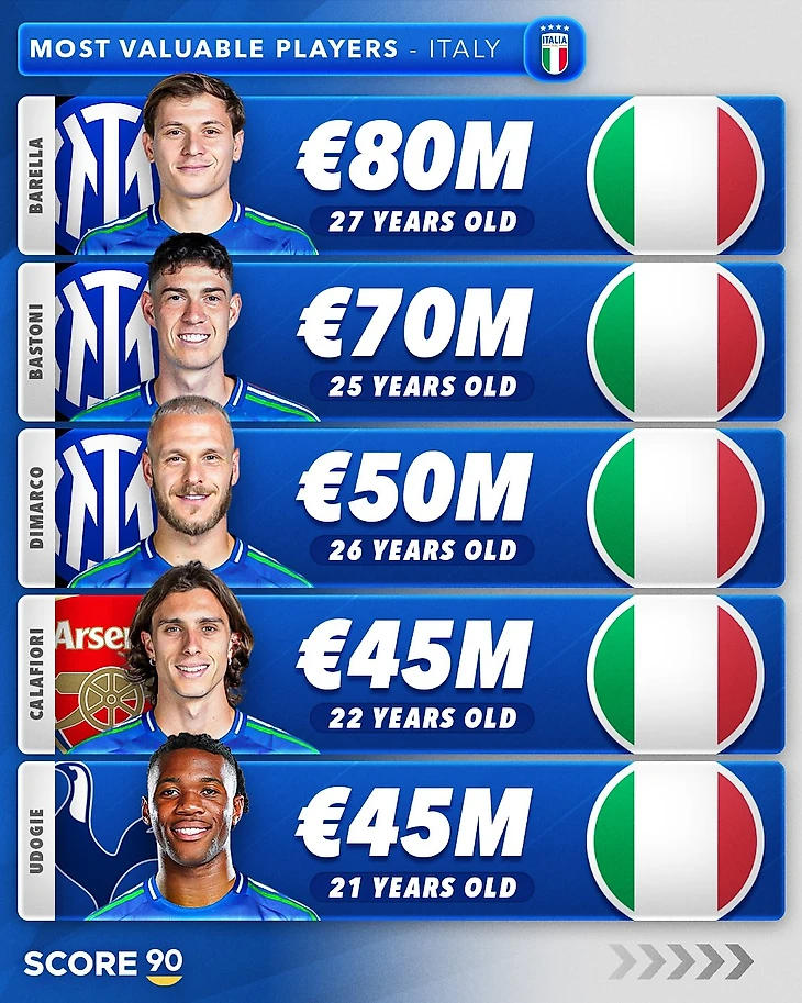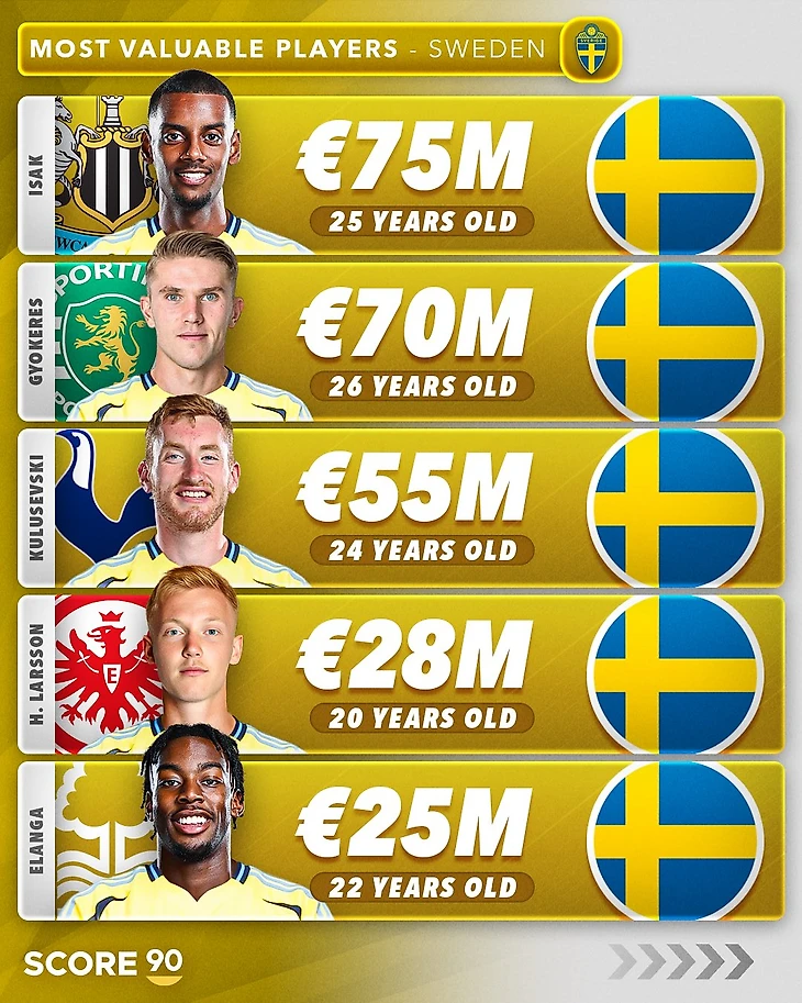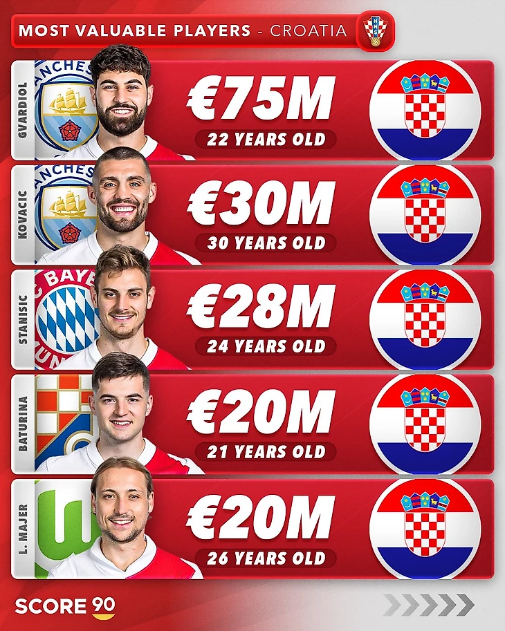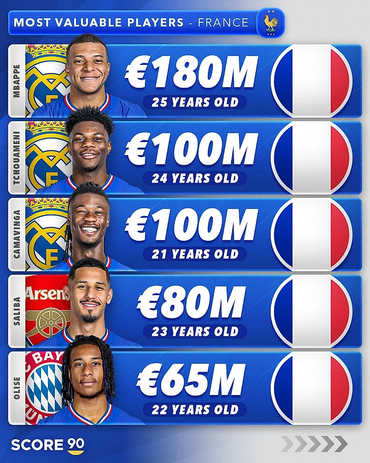 Transfermarkt обновил стоимость игроков из европейских чемпионатов. На основе новой информации портал Score 90 составил рейтинги самых дорогостоящих игроков из 13-ти европейских сборных.