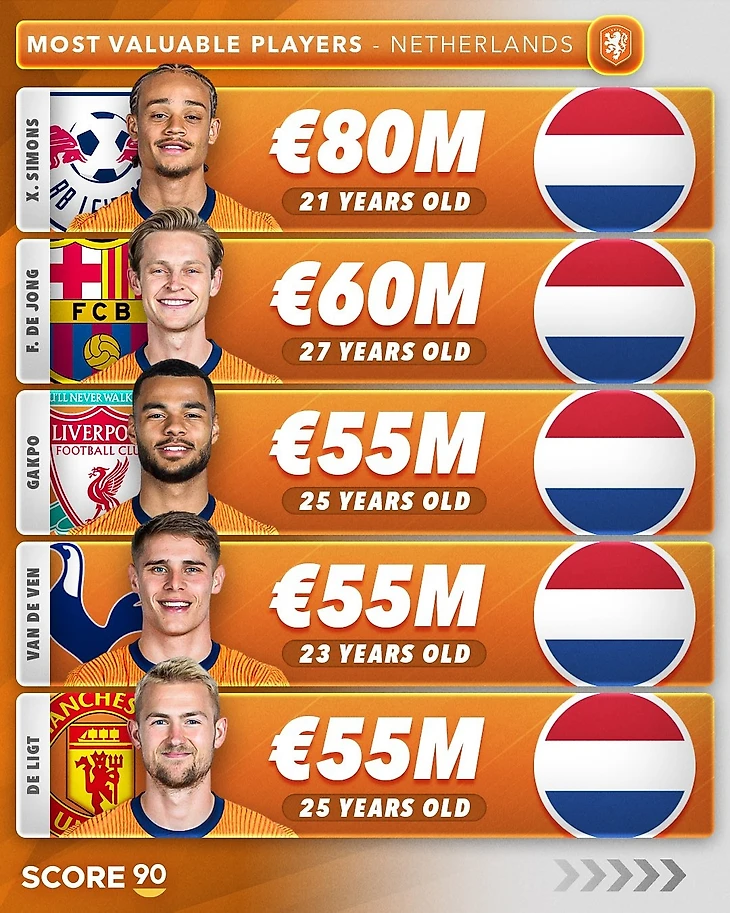 Сразу три игрока заняли третью строчку топа самых дорогих представителей голландского футбола. Примечательно, что ни один из игроков не выступает в родном чемпионате.