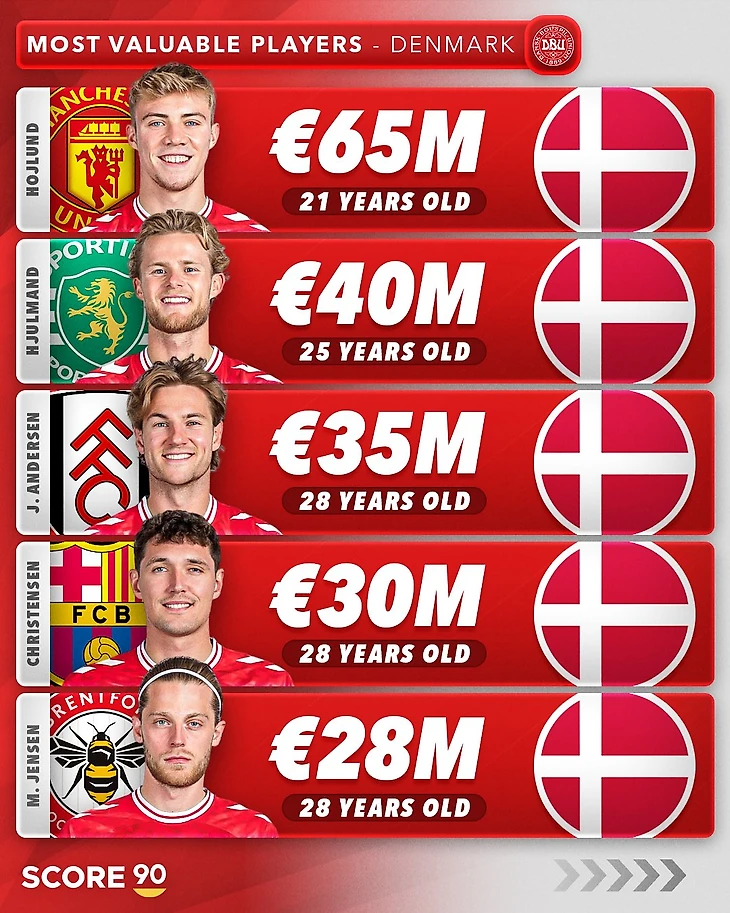 Расмус Хейлунд – самый молодой и самый дорогостоящий представитель датчан. Трансферная стоимость нападающего «Ман Юнайтед» держится на уровне 65 млн евро с октября 2023 года.