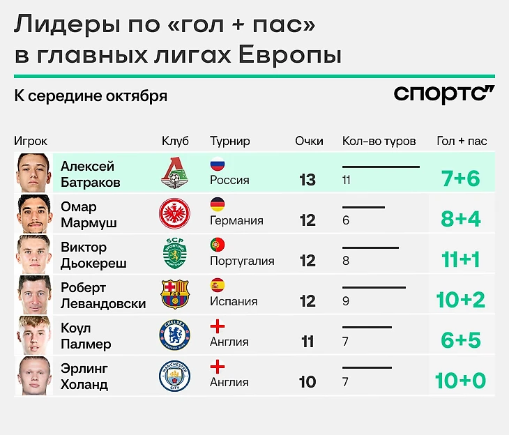 Всего шесть футболистов, включая Батракова, уже набрали не менее десяти очков в главных лигах Европы. Для примера взяли первые десять лиг по рейтингу УЕФА (топ-5 плюс Нидерланды, Португалия, Бельгия, Чехия и Турция) и РПЛ.
