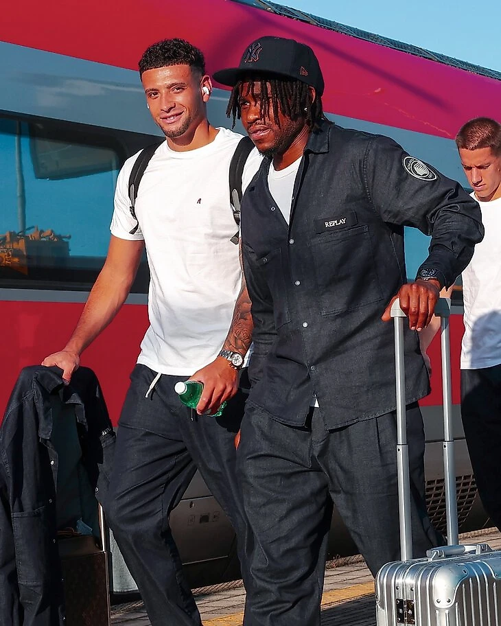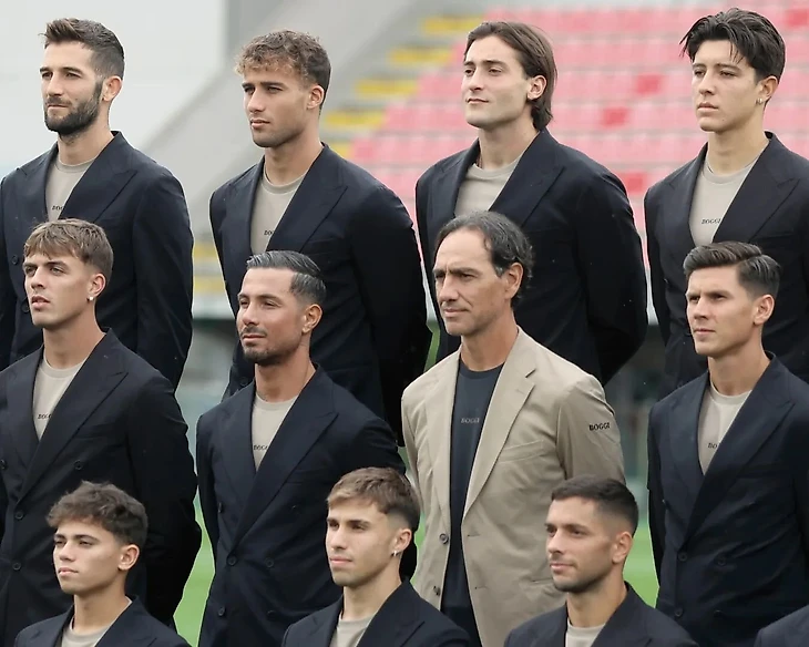 «Лечче» одевается у молодого местного и премиального бренда Tomeve’s. Образ футболистов состоит из замшевой рубашки-куртки из телячьей кожи и классических брюк со складками и манжетами внизу.