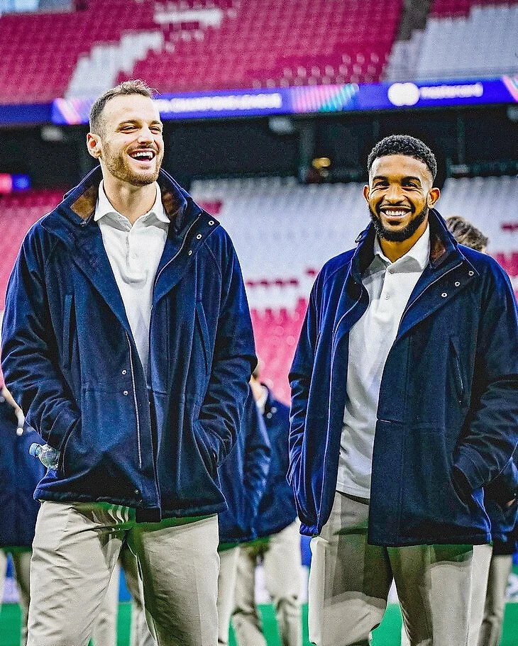 Обычно Loro Piana тщательно выбирает послов. В 2021-м они запартнерились с «Ювентусом» (Роналду тогда еще играл в Турине). И на этот сезон подготовили для «Юве» несколько нарядов. В каждом из них светлые брюки. Верх меняется. Есть синие рубашки. И футболки с длинным рукавом и воротником поло.