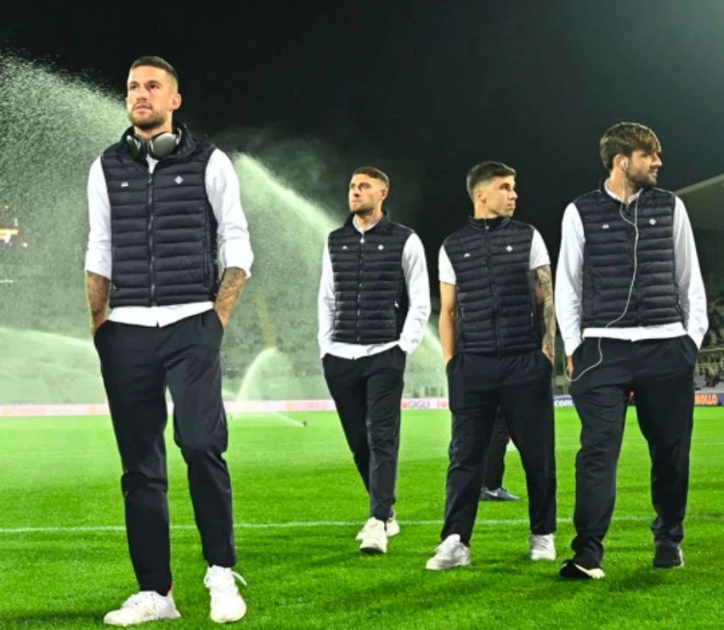 С «Фиорентиной» Montezemolo сотрудничает уже несколько лет. В основном игроков одевают в деловые наряды. Как этот – брюки, лонгсливы и жилетки. Строгий стиль, сдержанные цвета.