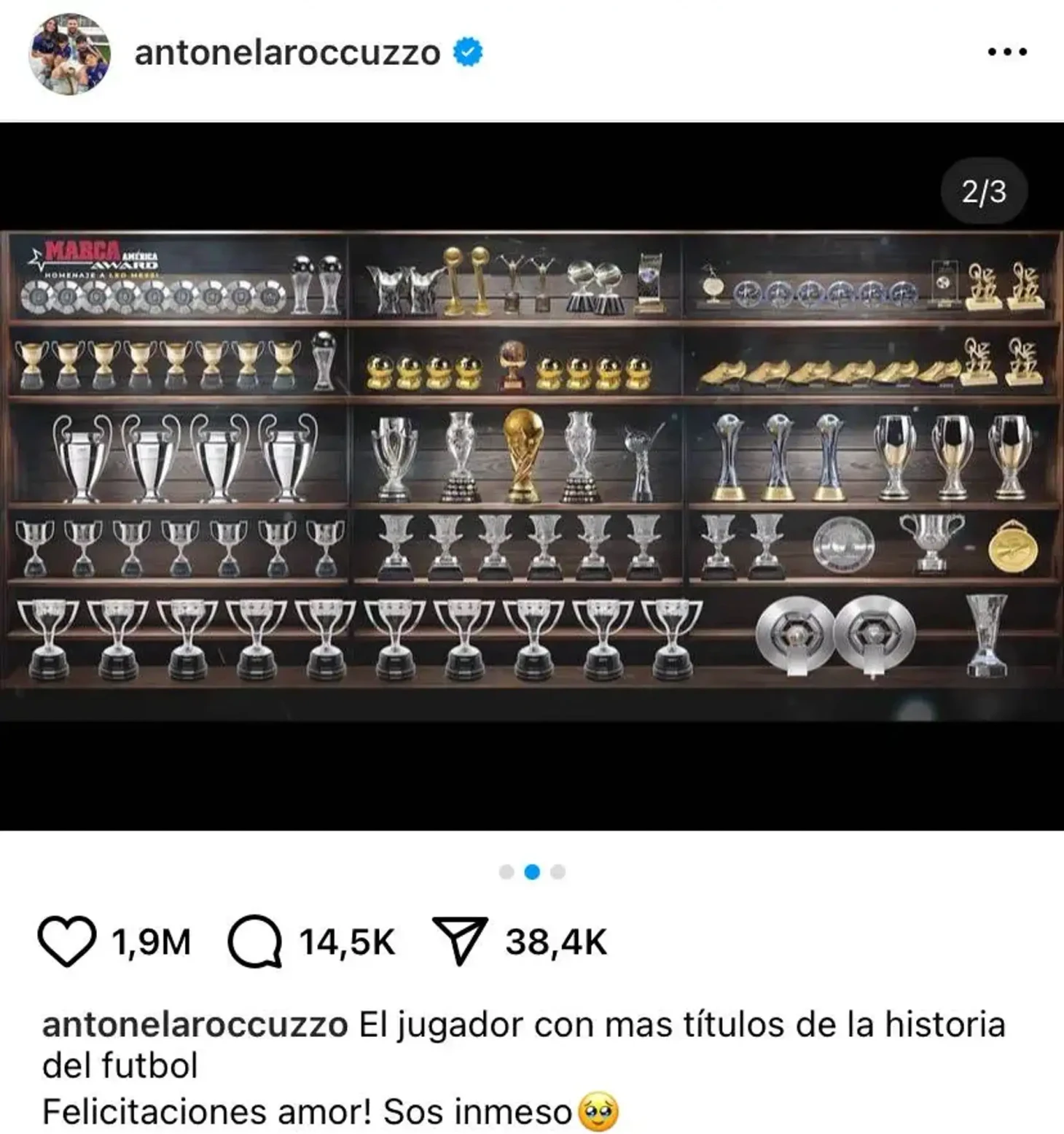 Пока Лео скромно благодарил всех в соцсетях, его жена Антонела Роккуццо не сдержалась и с гордостью написала: «Лучший игрок в истории с наибольшим количеством трофеев! Поздравляю, любовь моя! Ты невероятен!».