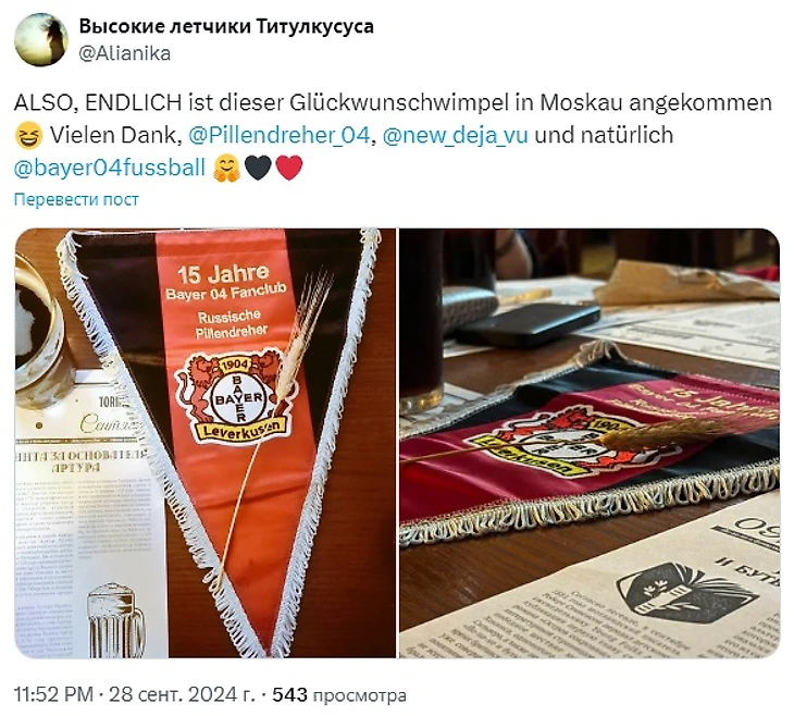 Кстати, российский фанклуб «Байера» «Russische Pillendreher» («Русские аптекари») получил от объекта своего обожания подарок на 15-летие! Вымпел был вручен одному из членов фан-комьюнити, живущему в Германии, еще год назад, но только сейчас доехал до Москвы, где и был торжественно презентован фанклубу во время совместного просмотра матча «Бавария» – «Байер»!