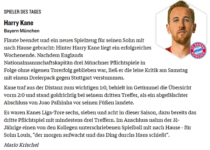 Кейн наконец оформил немецкий хет-трик – когда три мяча забиты последовательно в одном тайме. После матча Харри шутил: «Думаю, что некоторым парням уже надоело подписывать мячи. Но я буду стараться, чтобы продолжать забирать их себе домой!».