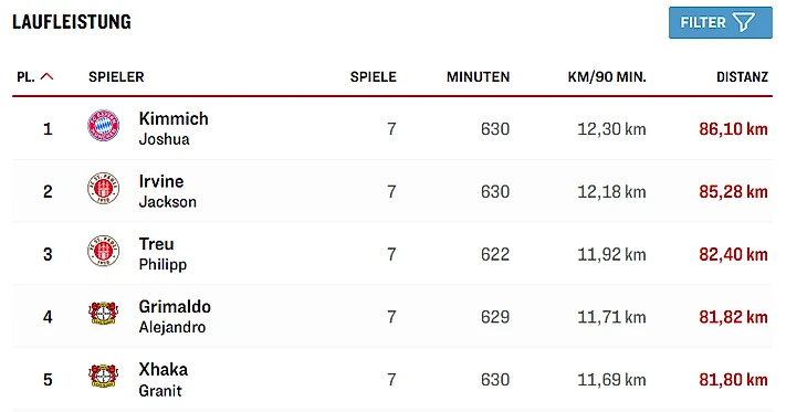 Игрок – кол-во игр – кол-во минут – в среднем км за 90 мин – всего км
