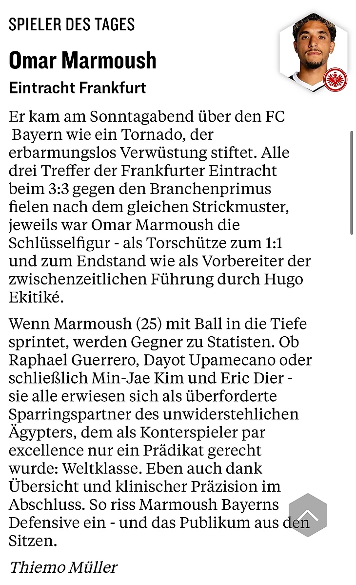 А вот в матче с «Байером», к сожалению, Омар уже был бессилен, и его гол (кстати, счет в той встрече открыл именно Мармуш) изменить не мог. Еще и на результат матча мог повлиять спорный момент – в самой концовке был отличный шанс у Экитике сравнять счет, но форвард не смог занести мяч в пустые ворота – помешал Джонатан Та. Мяч попал ему в руку, но пенальти не назначили, и момент даже не был просмотрен на VAR, что вызвало много вопросов от игроков и менеджмента «Айнтрахта». Так, главный тренер Дино Топпмеллер после матча заявил: «В нашу пользу не был назначен чистый пенальти. Я не понимаю, как это не увидели или хотя бы не просмотрели эпизод. Я уважаю Феликса Брыха (прим. главный судья матча), но сегодня я потерял дар речи. Это был явный фол. Ребята из-за этого расстроены и злы. В таких топ-играх часто решают мелочи. Мы очень разочарованы результатом, но гордимся игрой этой очень молодой команды».