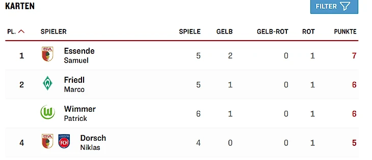 Игрок – кол-во игр – желтые – 1+1 желтые – красные – всего