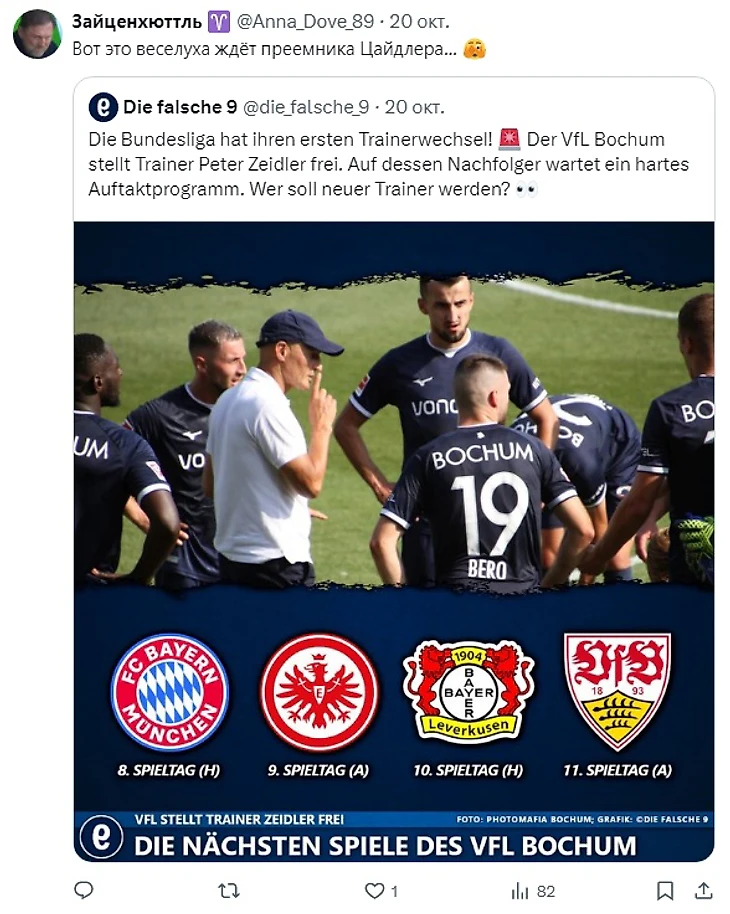 Клуб уже заявил, что бывшие помощники главного тренера Маркус Фельдхофф и Мурат Урал, у которых есть профессиональные лицензии УЕФА, вступят в должность «до дальнейшего уведомления». Также в прессе появлялась информация, что «Бохум» нуждается не только в новом главном тренере и спортивном директоре, но также в новом менеджере команды и, возможно, в новом главном скауте. Судя по всему, результаты сподвигли руководство на чистку рядов. А впереди чудовищная серия матчей: против «Баварии», «Айнтрахта», «Байера» и «Штутгарта». Фанаты уже задаются вопросом, насколько пополнит свой бомбардирский счет Харри Кейн уже в ближайшие выходные.