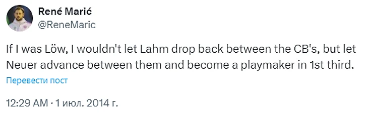 Тут хочется вспомнить давний твит Рене Марича. В 2014 году 21-летний австрийский журналист написал: «Будь я на месте Лева, я бы не опускал Лама между центральными защитниками. Я бы позволил Нойеру подниматься выше и занять роль плеймейкера в первой трети».