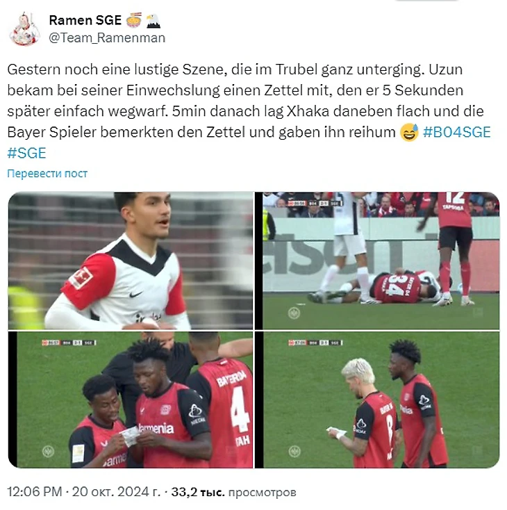 Под конец отчетного отрезка «Байер» набрал-таки три очка, хотя матч с «Айнтрахтом» также выдался непростым. Леверкузенцы не забили пенальти, потом пропустили с пенальти, но смогли собраться и одержать волевую победу. Голами отметились Бонифейс и, пожалуй, лучший на отрезке игрок «аспириновых» Роберт Андрих. Игру испортил только главный судья, ибо все назначенные пенальти в игре были весьма странные, а вот не поставленный в конце в ворота хозяев одиннадцатиметровый был более чем очевидным, что вызвало гнев гостевого сектора. Феликс Брых за работу получил 6 баллов, что в немецкой системе координат оценки судейства – примерно «кол»! Забавный эпизод случился после выхода на замену игрока «Айнтрахта» Узуна. Он получил какие-то указания от тренера на листке бумаги и, решив не следовать примеру Томаса Мюллера, благополучно выбросил его на газон. Через пару минут рядом с листком упал Джака, вокруг которого столпились игроки «Байера», заметили листок и поочередно его прочитали.