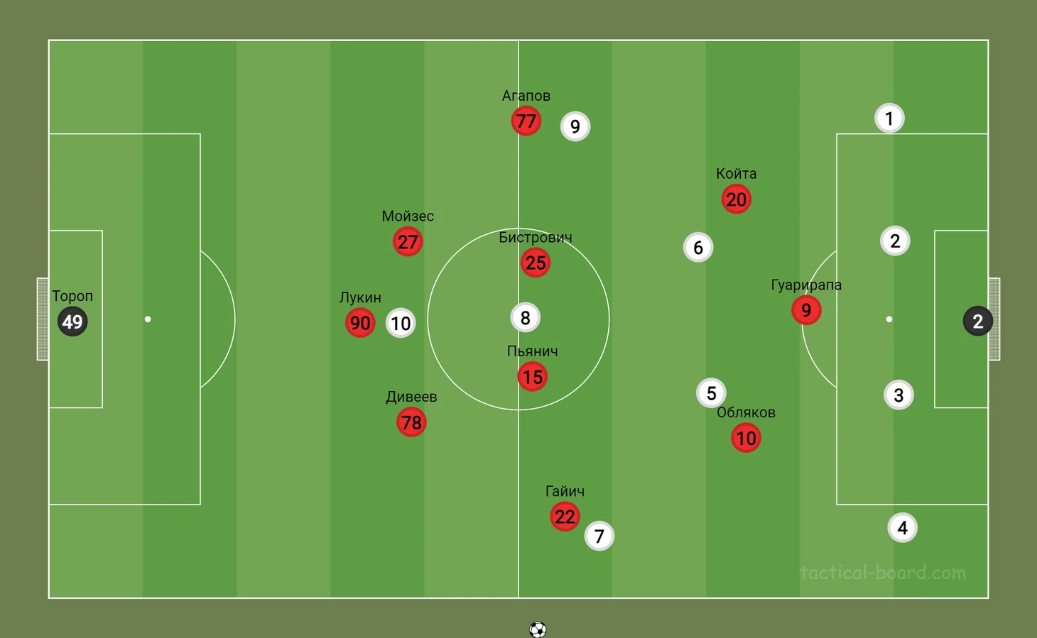 ЦСКА атакует модулем 3-1-5-1, где в роли реджисты(игрок, начинающий атаки) расположен Пьянич. 93% точных передач и 1 голевая это все про Миралема. Наконец-то у ЦСКА появился метроном в центре поля, который когда надо успокоит игру, а иногда наоборот ускорит. Также очень понравилось взаимодействие Пьянича с Обляковым, который неоднократно шел ближе к центру чтобы помочь в созидании. Еще одной из фишек была ротация между Обляковым и Гайичем, которые походу атаки могли поменяться местами.