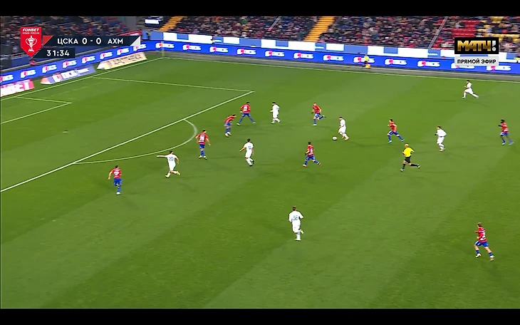 Ну а в 3 зоне (зона чужой штрафной) красно-синие шли высоко каждый в каждого, при этом бросая дальнего игрока. «Ахмату» зачастую было тяжеловато выйти низом из под такого давления, по этому диагонали стали для гостей планом б.