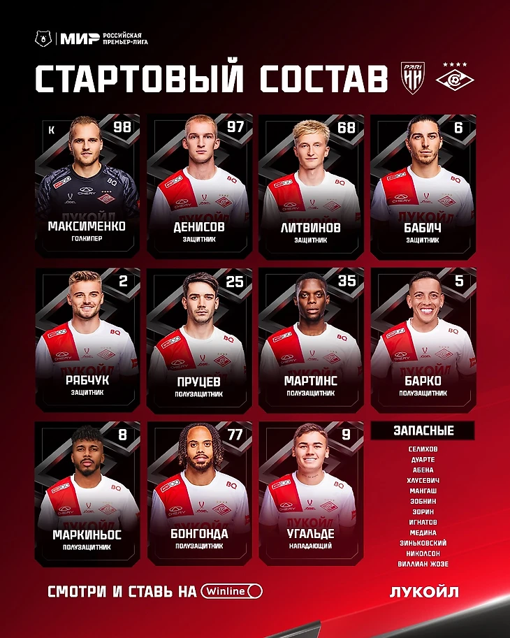 Запасные: Селихов, Дуарте, Абена, Хлусевич, Мангаш, Зобнин, Зорин, Игнатов, Медина, Зиньковский, Николсон, Виллиан Жозе.