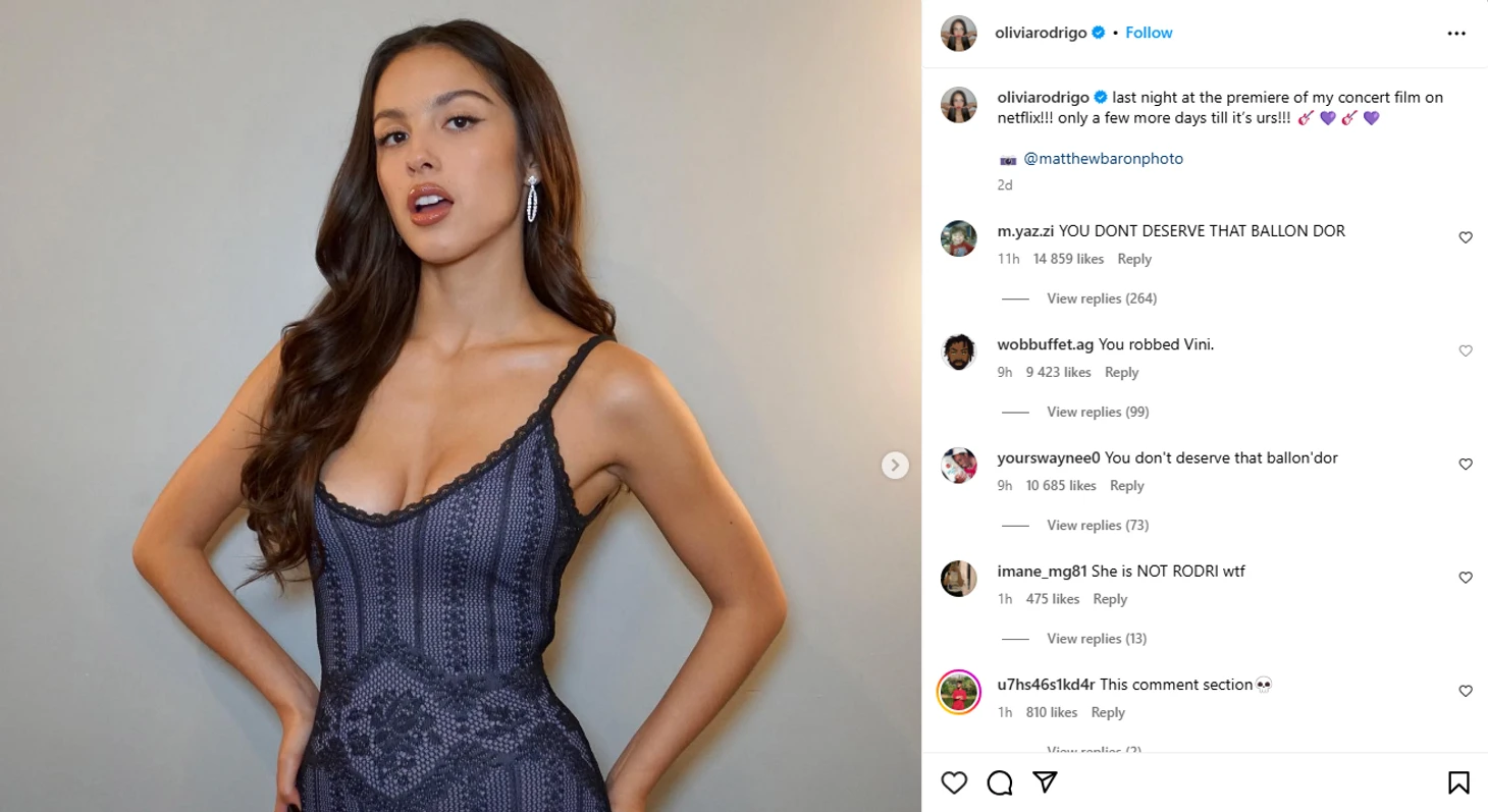Досталось и певице Оливии Родриго. Поклонники Винисиуса пришли в комментарии к девушке все с той же претензией: «Золотой мяч» нужно отдать бразильцу.