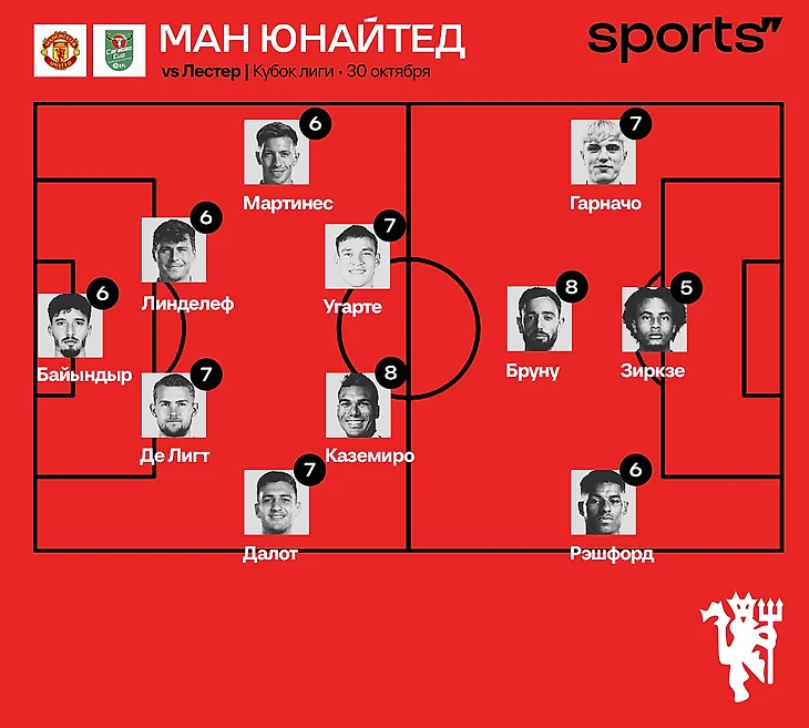 Каземиро (8) – классный дубль, особенно первый мяч (дальний удар в девятку). В созидании тоже все по делу. В обороне немного ошибся перед вторым пропущенным: не достал мяч головой, тот срикошетил на Далота, а потом оказался в ногах соперника.