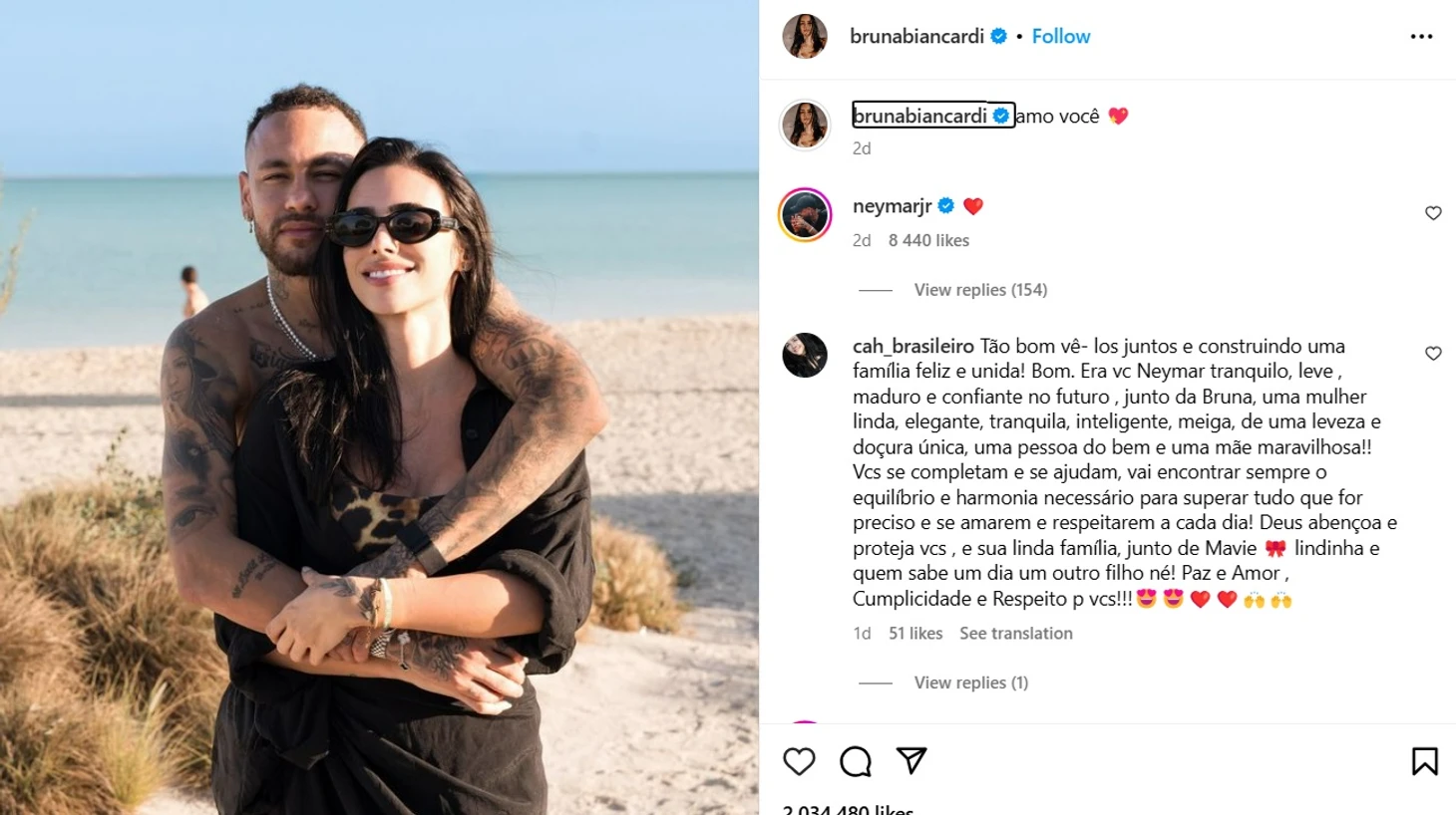 Рядом с фотографией, на которой они обнимаются на живописном пляже, Бруна написала в Инстаграм: «Amo voce 💖 (Люблю тебя)».